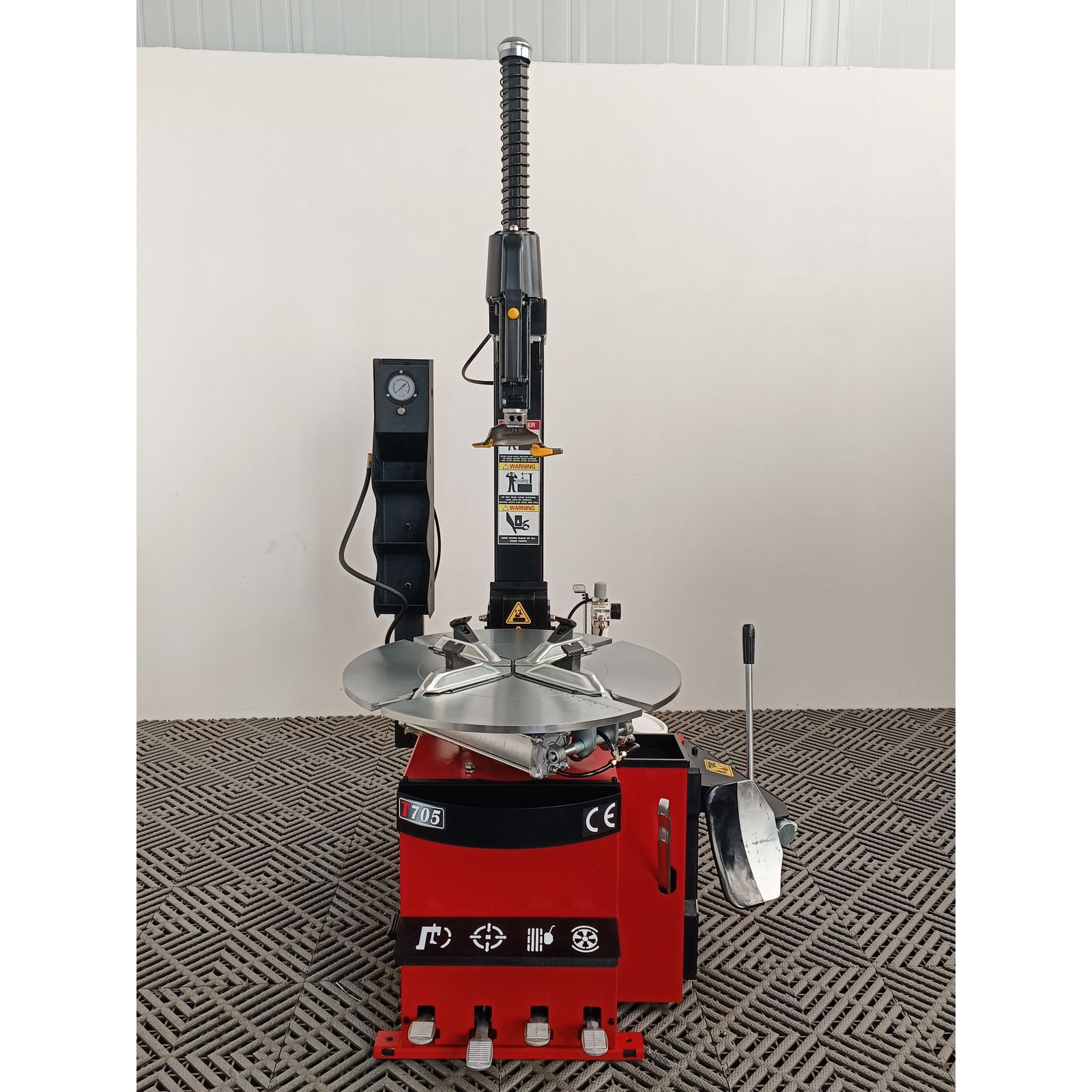 Ø Automatic tyre changer with pneumatic tilt-back tower.